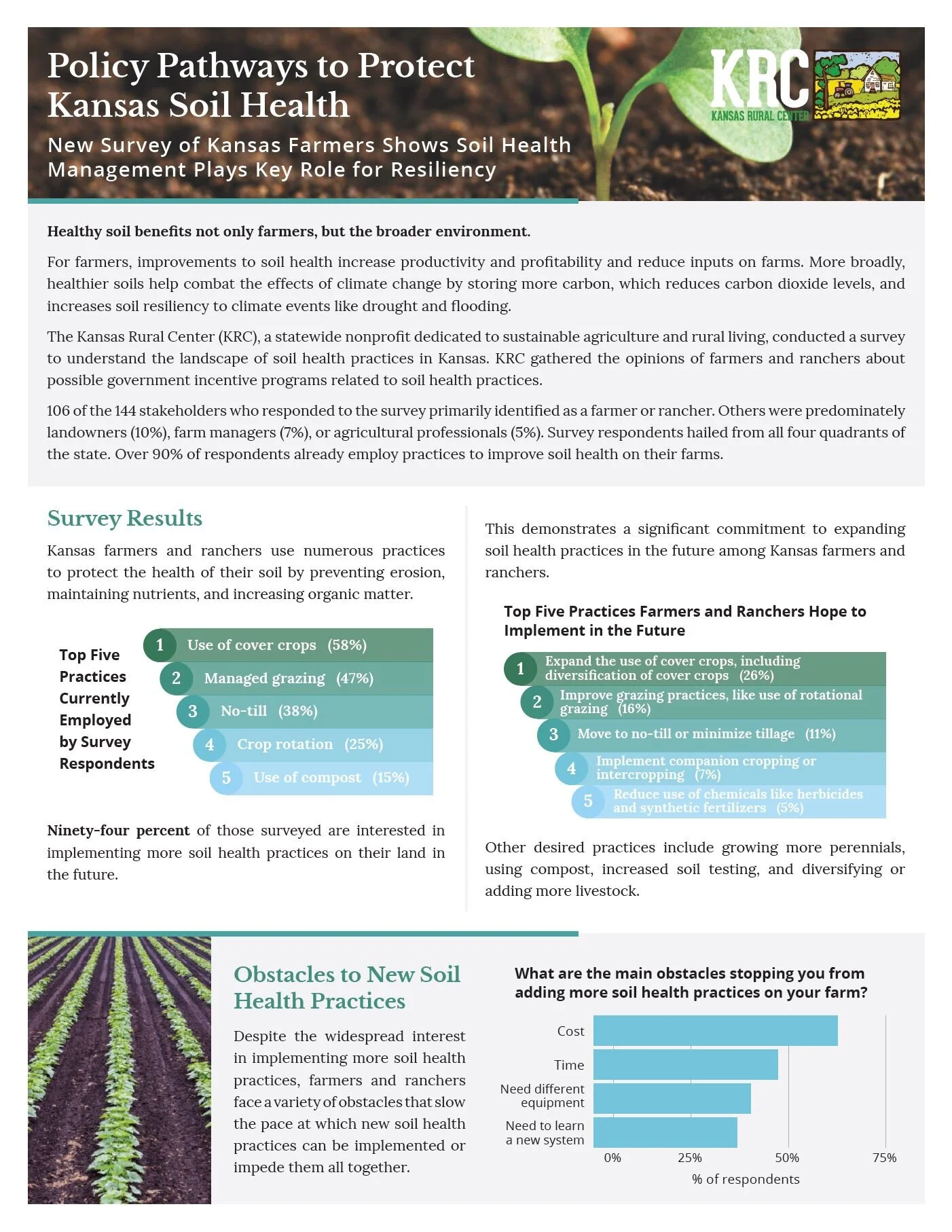 In the Fall of 2020 the Kansas Rural Center conducted a survey on the soil health practices used by farmers in Kansas, as well as their attitudes toward policy initiatives that would support increasing these practices. KRC created a report of the survey results, meant to inform legislators about the opinions and concerns of farmers regarding soil health. In the second part of this project KRC formed a panel of ten farmers who participated in feedback sessions with legislators during the 2021 legislative session.